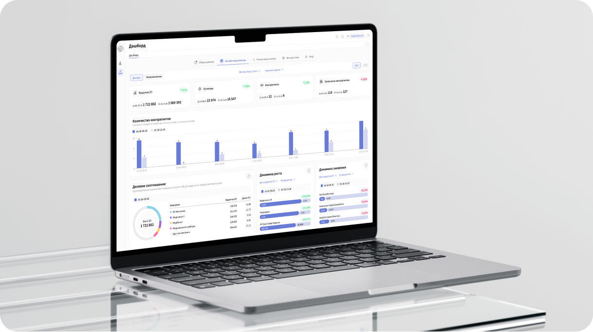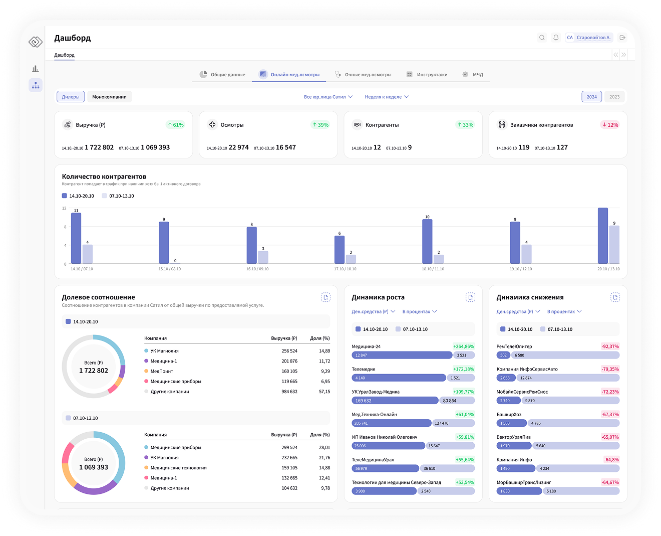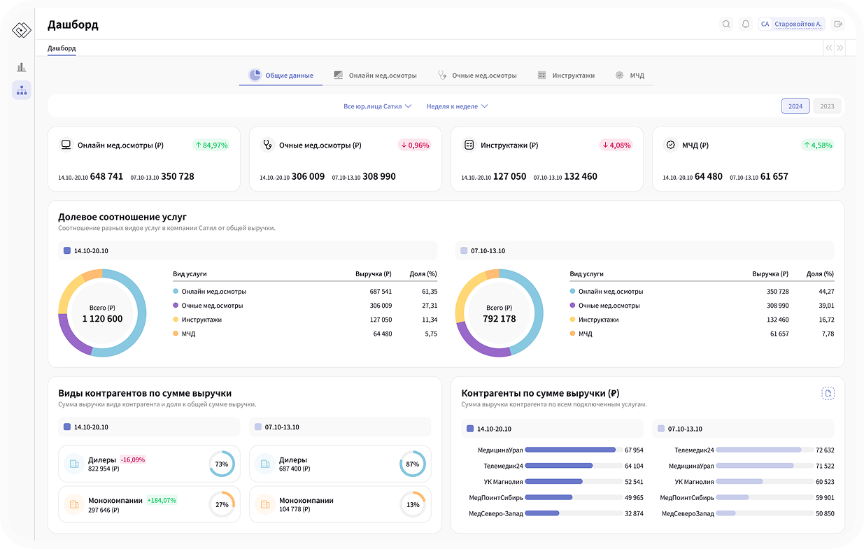 По общей работе сервиса необходимо следить за выручкой, влиянием контрагентов на оборот компании, а также наиболее рентабельными и нерентабельными видами услуг.