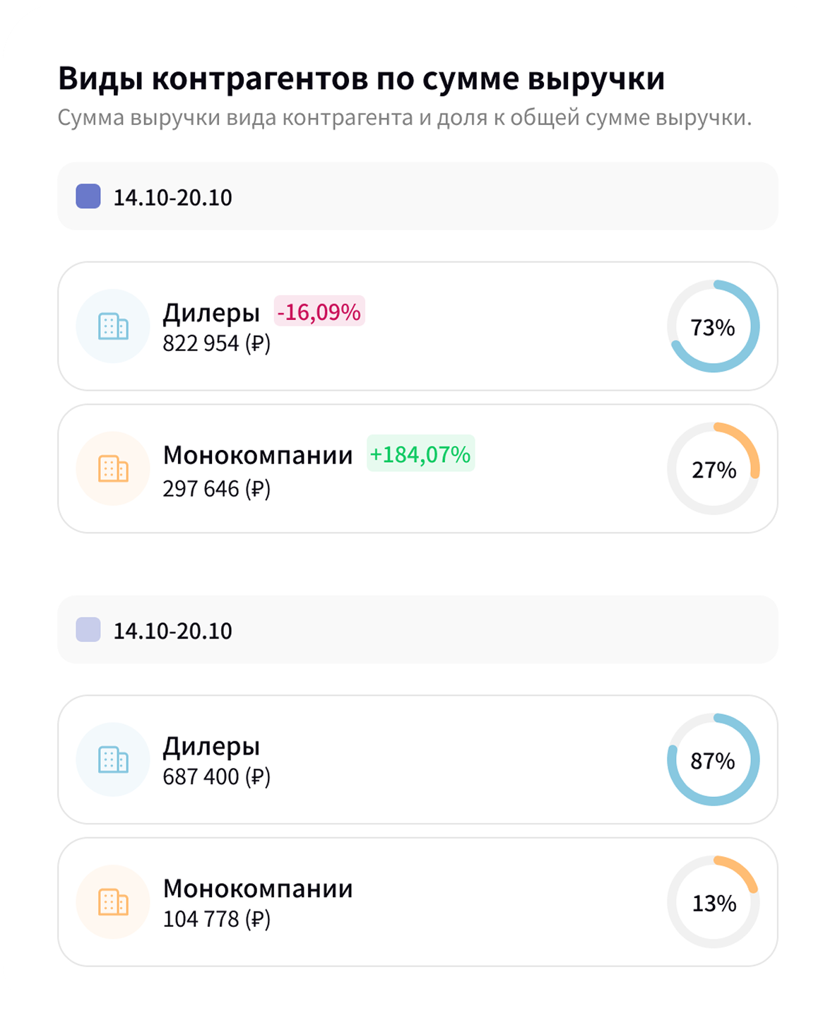 Показывает выручку в рублях и долевое соотношение от общей выручки Сатила по двум видам контрагентов, с которыми работает непосредственно Сервис.