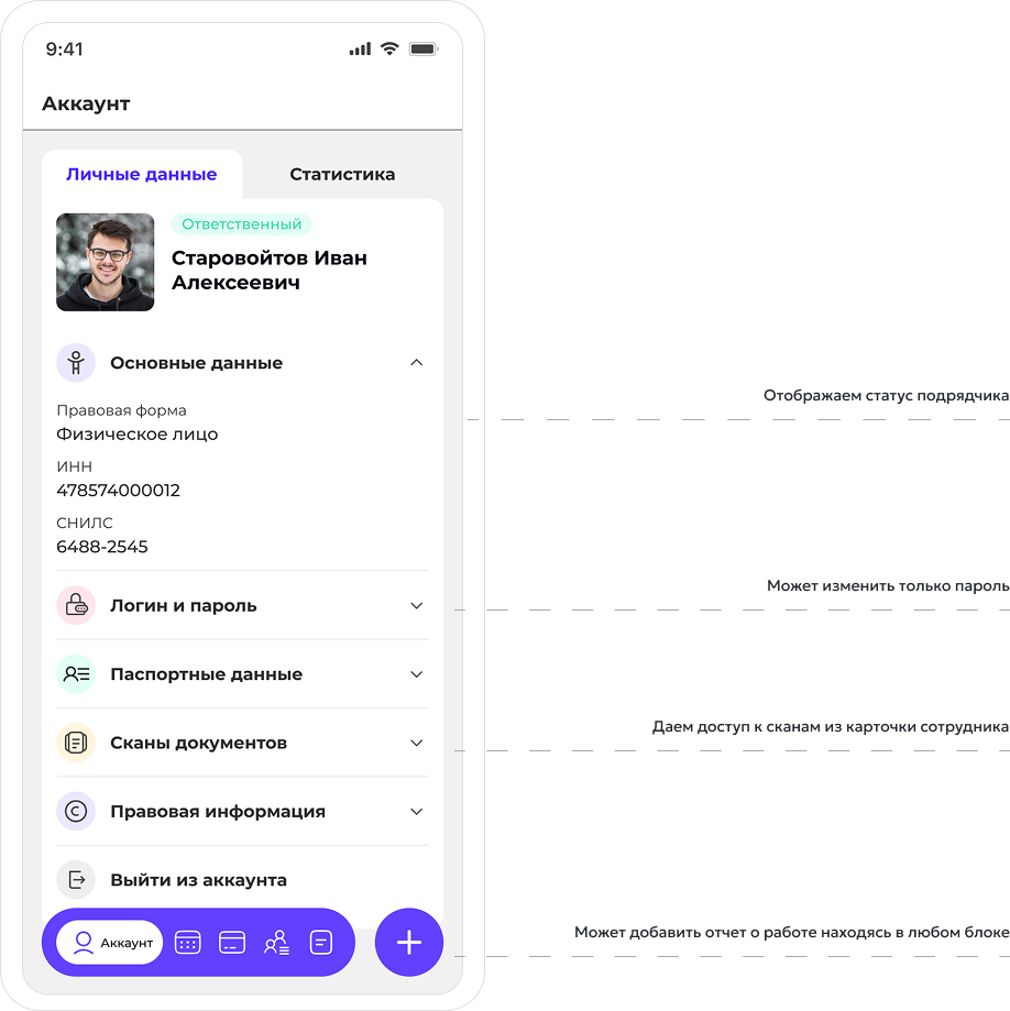 Так как это правовая информация, сотрудник может изменить только пароль и аватарку.